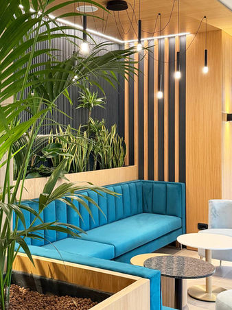 Greenery is treated as a fundamental architectural element. Integrated planters and vegetated partitions define zones, filter views, and create layered spatial experiences, transforming the interior into a living landscape.