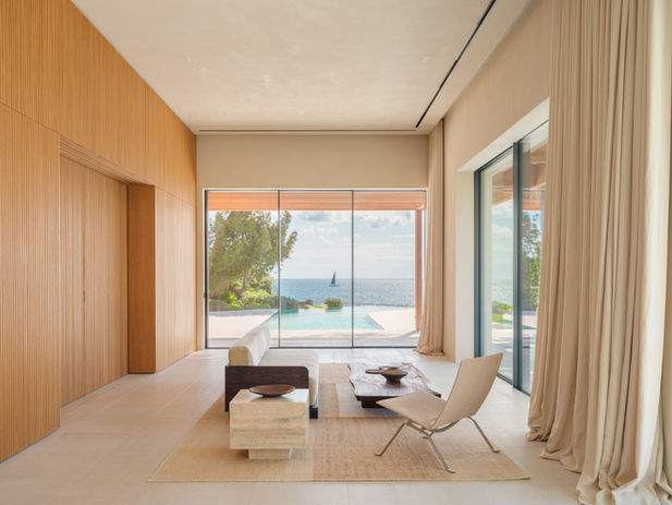 A key element in the design is the living room, conceived as a large loggia that provides a direct connection to the garden and sea. Large windows and a new portico create a seamless flow between the indoors and outdoors, reinforcing the villa's emphasis on indoor-outdoor living. The villa’s design avoids imposing monumental elements, instead focusing on enhancing the quality of space with a refined use of neutral tones and tactile materials. The architecture feels integrated with the landscape, not competing with it, and enhances the sense of immersion in nature.